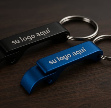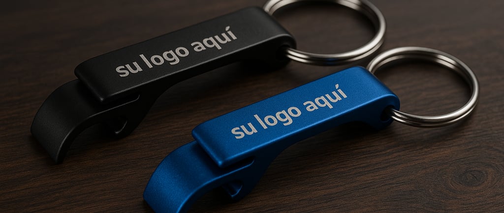 Regalos masivos pero útiles: bolígrafos, llaveros, libretas simples.